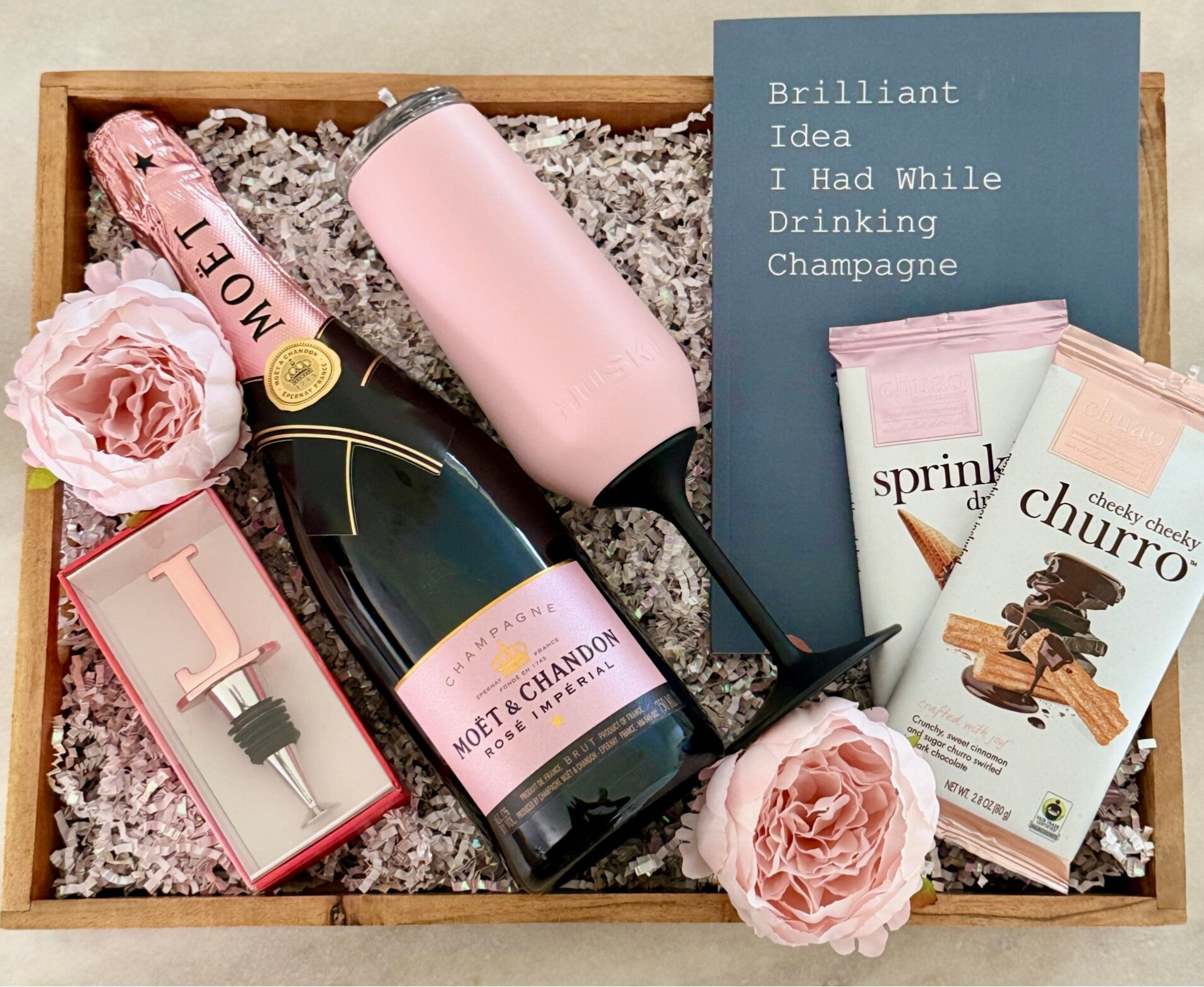 This custom tray includes, Premium Champagne (Moet), monogram wine stopper, Husky Flute tumbler, journal and luxe chocolates.