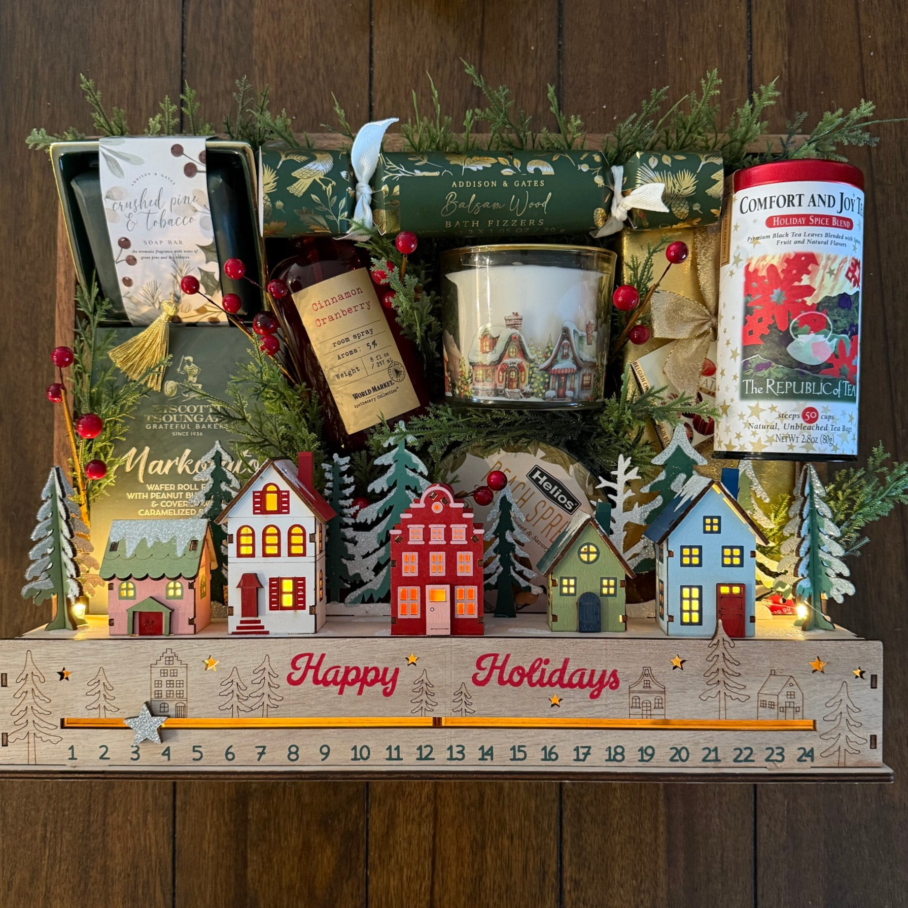 This festive Luxe Tray includes a beautiful light up Christmas village count down calendar, gourmet spread and sweets, holiday tea, candle and aroma spray, bath fizzers and artisan soap.