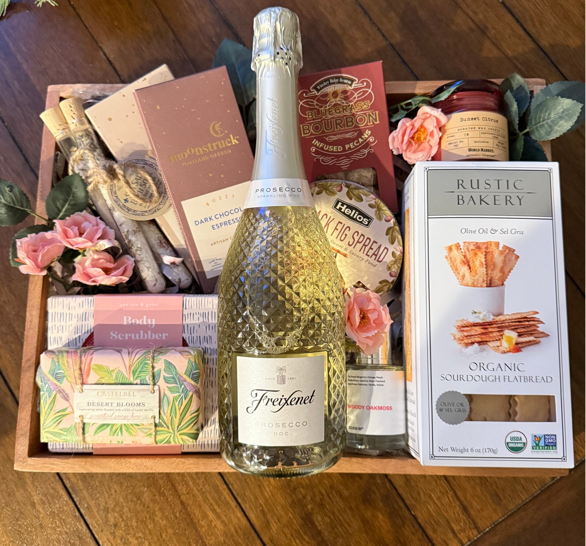 This Luxe Tray includes a beautiful bottle of Prosecco, perfume, candle, bath salts, body scrub, artisan soap, gourmet sweets and spread with arisan crackers.